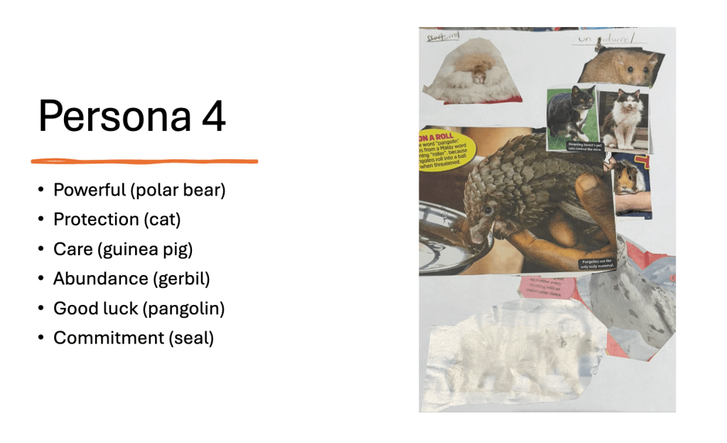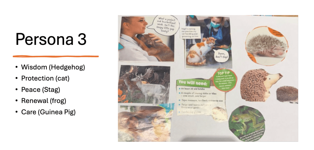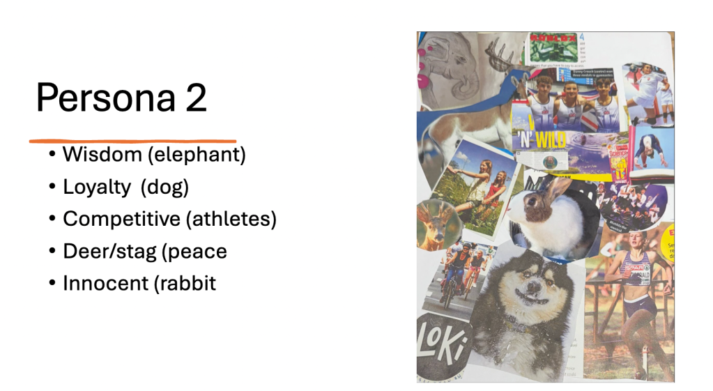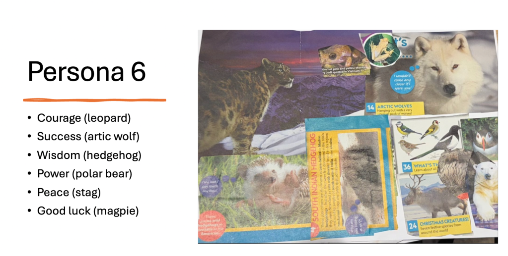 The children were asked to create personas to describe themselves using collage. At first, they found it difficult to choose images. I explained that they should just use the images they felt drawn to. They were not guided to use animals, but it is interesting that animals featured so prominently. These children felt they could connect their own personality with how they felt about certain animals.